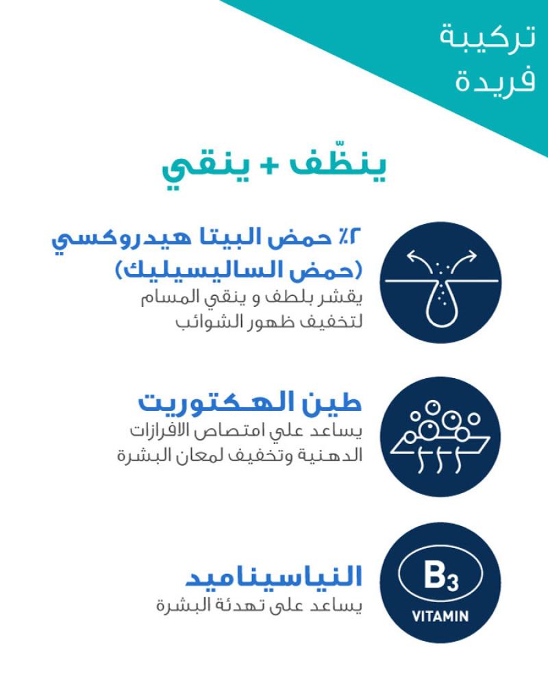 • تقشير لطيف: يحتوي على 2% من حمض الساليسيليك الذي يساعد على تقشير البشرة بلطف وإزالة خلايا الجلد الميتة، مما يقلل من ظهور الرؤوس السوداء والمسام الواسعة.